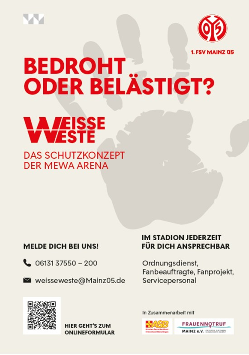 Um den Fans ein noch sicheres Stadiongefühl zu geben, hat der FSV Mainz 05 das Schutzkonzept „Weiße Weste“ eingeführt. Hier können sich Fans melden, die sich bedroht, belästigt oder anderweitig unwohl/ unsicher fühlen.