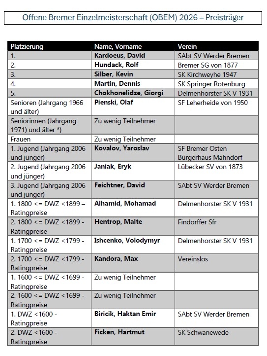 Besonders erfreulich aus Werder Sicht war zudem das starke Abschneiden des Nachwuchses: Mit David Feichtner, der den dritten Platz in der Jugendwertung belegte, sowie Haktan Emir Biricik, der einen Ratingpreis in der Kategorie DWZ <1600 gewinnen konnte, unterstrichen die Werder-Talente eindrucksvoll ihr Potenzial und sorgten für zusätzliche grün-weiße Erfolgserlebnisse.